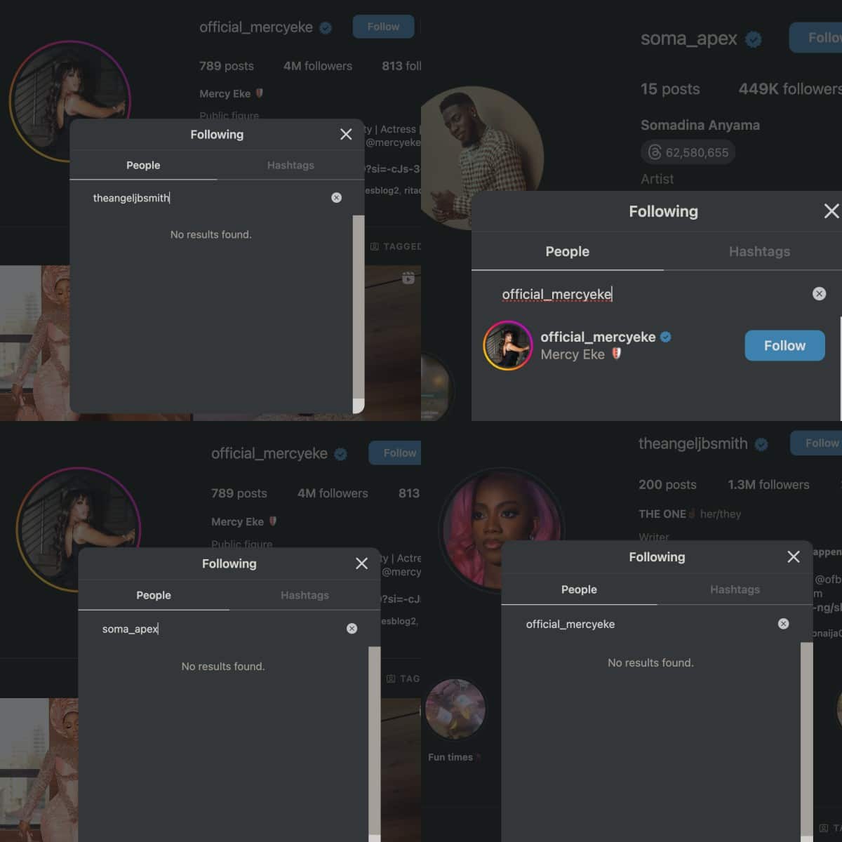 However, an unexpected development came to light yesterday evening when fans noticed that Mercy Eke had unfollowed Angel and Soma on her Instagram account.